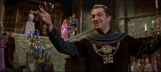 Now, on to my favorite Price movie: The Masque of the Red Death. Based on the Edgar Allan Poe story by the same title, this vibrant film tells the story of Prince Prospero (Price) as he and a large selection of guests take refuge from a plague, the Red Death, within his lavish castle. What I love most about this movie is its balance of beauty and darkness, upheld through the film’s opulence and Price’s emotional performance. The film is visually stunning, from its saturated colors, luxuriant decor and costumes, and fantasy-level Gothic imagery. Price demonstrates the deterioration of Prospero’s character by transitioning from confidence and power to fear and vulnerability when his measures fail and the Red Death finds him in his fortress. With his undeniable flair for Gothic aesthetic and ability to portray the deepest of human emotions, Price was a clear choice for multiple leading roles adapted from Edgar Allan Poe’s stories. Other Poe adaptations in which Price starred include House of Usher (1960), Tales of Terror (1962), and The Raven (1963).