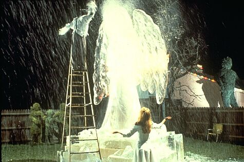 When I think of the feeling of the holiday season, the first image that comes to mind is the scene in Edward Scissorhands (1990) with the snow from Edward’s ice sculpture. Kim Boggs (Winona Ryder) begins in the family’s house helping her mother prepare for a Christmas party none of their neighbors will likely attend after a series of incidents involving Edward. Kim catches sight of something out the window not usually seen in her neighborhood…snow. When she investigates, she finds Edward standing on a ladder and carving an ice sculpture of a giant angel with his hands. The action of his scissors shaving through the ice has created the effect of snow. The scene becomes one of the most enchanting in Tim Burton’s body of work as Kim begins to dance in the falling ice.
