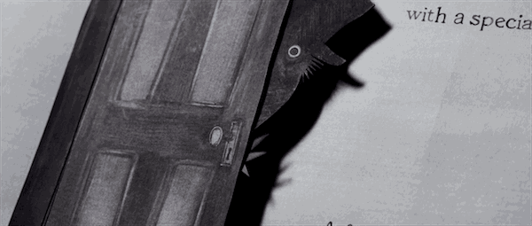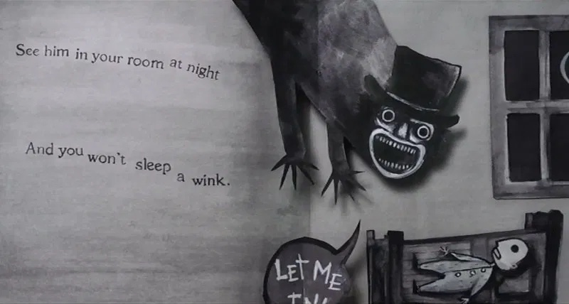 One night, Amelia lets Samuel choose a picture book from his bookshelf to read before bed. He returns with a book neither of them have seen before: it is a red-bound book with a single, solid black drawing of a figure wearing a top hat. The title of the book is Mister Babadook. Amelia begins to read: the book contains rough black-and-white illustrations, pop-up pages, and movable parts. The further she reads, the more Samuel becomes frightened of Mister Babadook. The text becomes increasingly more sinister, with the Babadook character hovering over the child in the story and implying that he will soon haunt them. The book causes even more anxiety in Samuel over several days, and Amelia decides to tear up the book and throw it away.