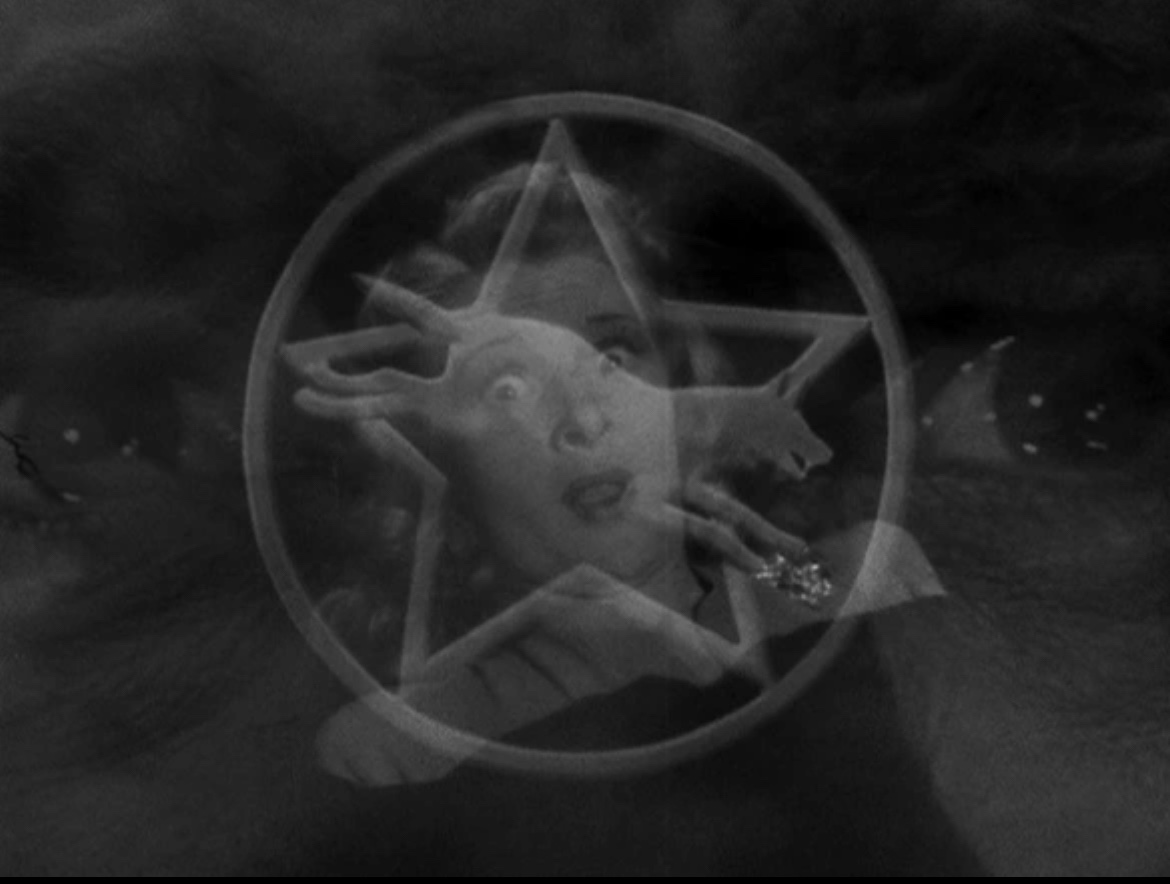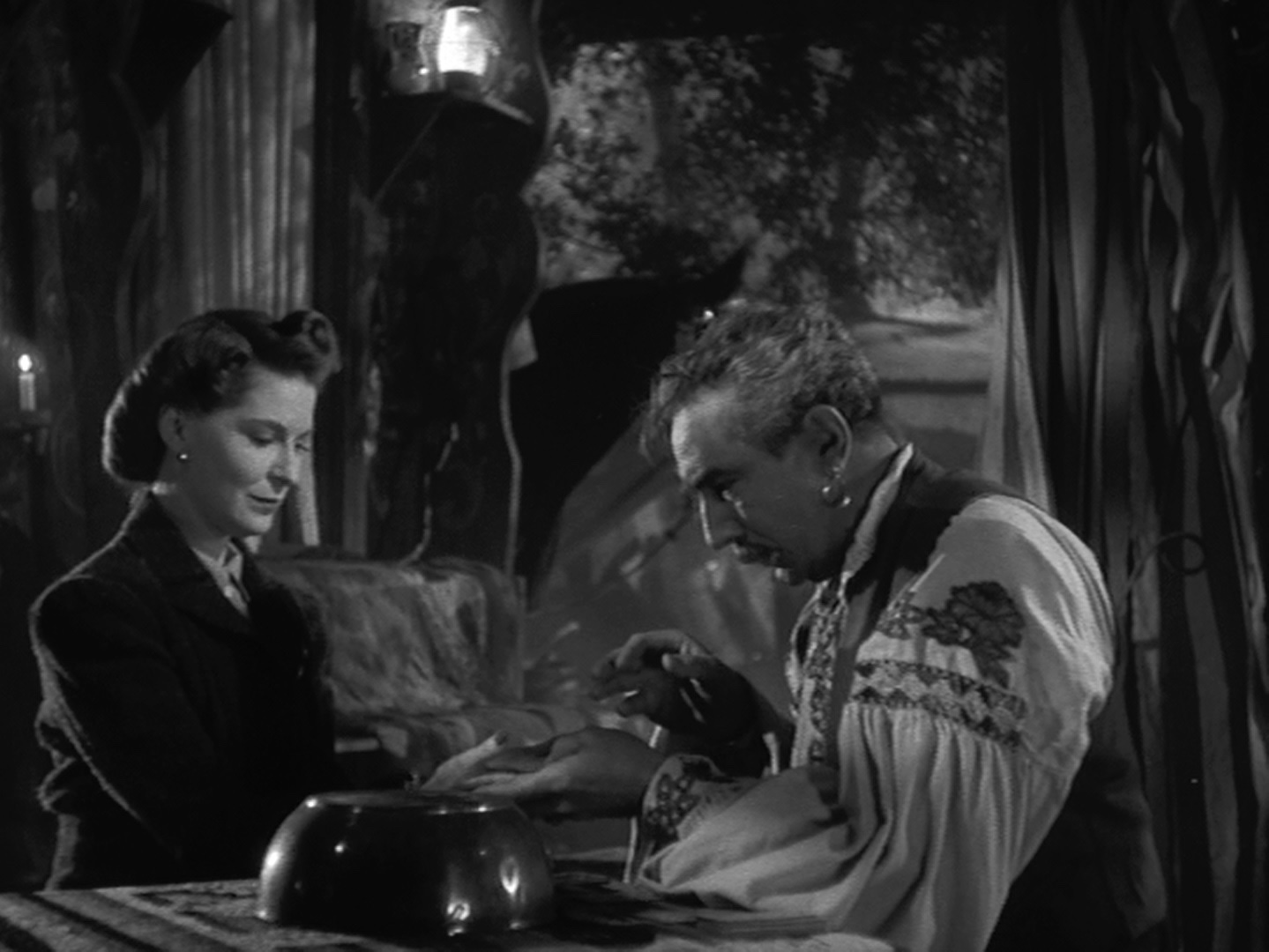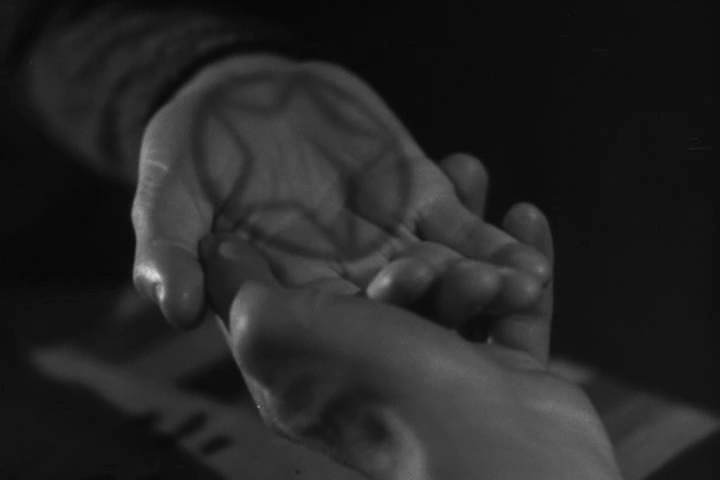 When Larry meets Gwen outside the shop, they are joined by Gwen’s friend, Jenny (Fay Helm). Larry does his best to hide his disappointment, and the three of them go to the woods where the fortune tellers have set up camp. Jenny goes first and is assessed by Bela (Bela Lugosi) while Larry and Gwen have a conversation nearby. Bela sees a five-pointed star in Jenny’s palm during the reading, and he commands her to leave immediately. Frightened by his change in demeanor and his refusal to tell her what he saw, Jenny runs away in distress. Soon, along with Jenny’s screaming, Larry hears the sounds of a large animal. Larry finds the creature and strikes it repeatedly with his cane. Jenny has been killed by the creature, and Larry is bitten before he kills it.