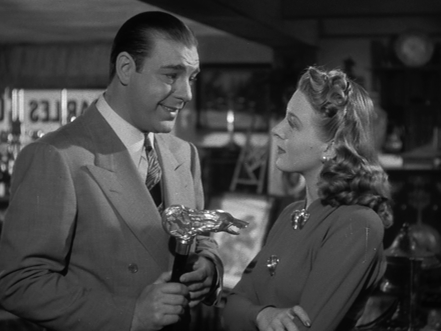 Lawrence Talbot (Lon Chaney Jr.) returns to his family’s estate in Wales following the death of his older brother. His father, Sir John (Claude Rains), wishes to discuss Larry’s future with Talbot Castle and his inheritance of the estate. During a very creepy first encounter in her father’s antique shop (more on that later), Larry meets Gwen Conliffe (Evelyn Ankers) and becomes interested in her. While in the shop, he purchases a cane with a silver wolf’s head and a star engraved on the top. Noticing the design, Gwen tells Larry about the folklore of werewolves. Larry sees some fortune-tellers traveling through the village after Gwen walks him outside, and he insists that she accompany him to have their fortunes read.