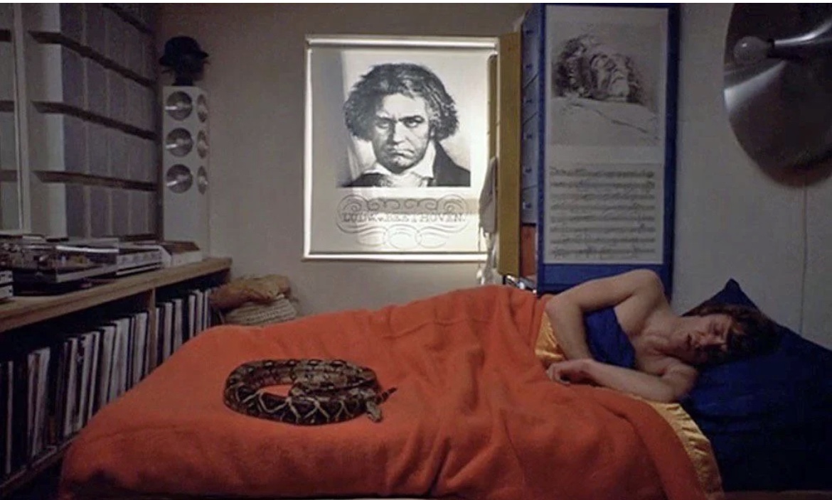 Something I have come to appreciate after getting more comfortable with watching this film is its art direction and cinematography. The production design, costumes, makeup, music (Symphony No. 9 by Beethoven has a significant presence in Alex’s experience), and Kubrick’s signature filming choices create an atmosphere where we feel a part of this world and gradually understand its nuances. It is a perfect example of the things we fear manipulated into a work of art, which is what I love most about horror and some cult films.