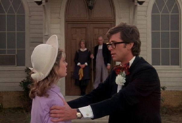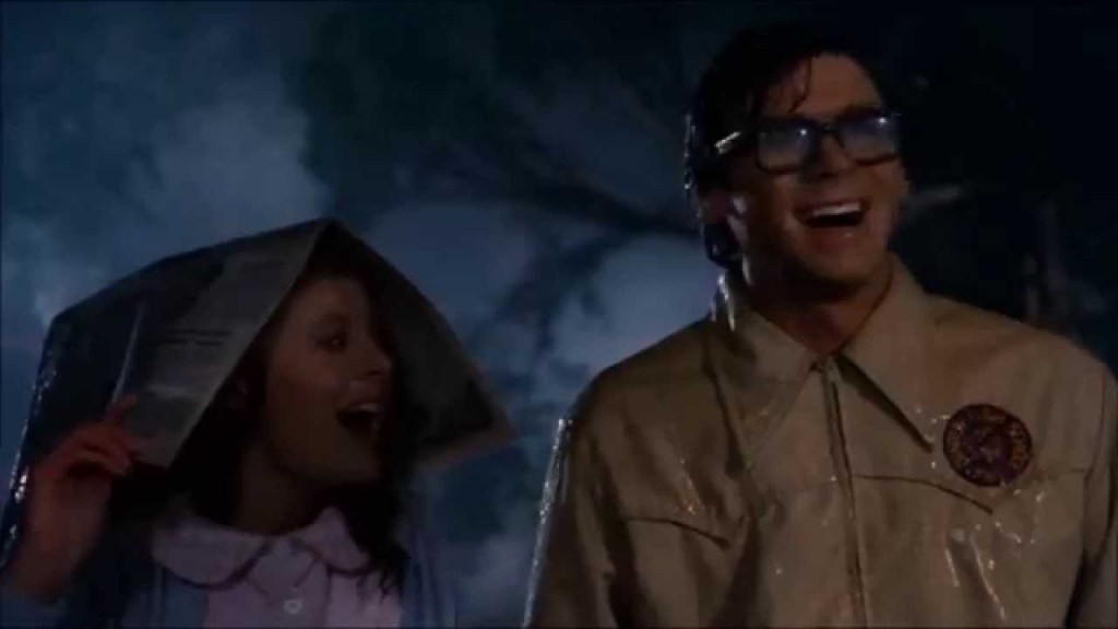 Following the iconic red lips performing “Science Fiction/Double Feature,” the movie begins with a young couple, Brad Majors (Barry Bostwick) and Janet Weiss (Susan Sarandon) after attending the wedding of two friends from school. After a conversation with the groom and after everyone leaves, Brad asks Janet to marry him. Janet enthusiastically accepts, and the couple decides to visit the teacher who taught the class where they met. The night they make the drive, they encounter heavy rain and an unusual number of motorcycles. When the car gets a flat tire, Brad and Janet set out on foot together to see if the owners of the castle they passed earlier have a phone they could use.