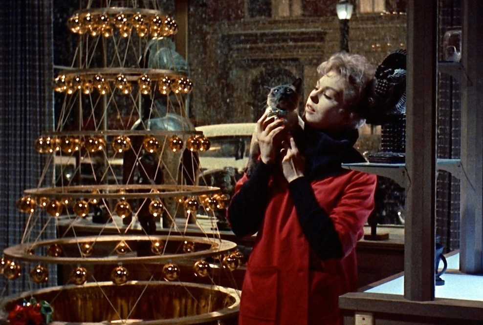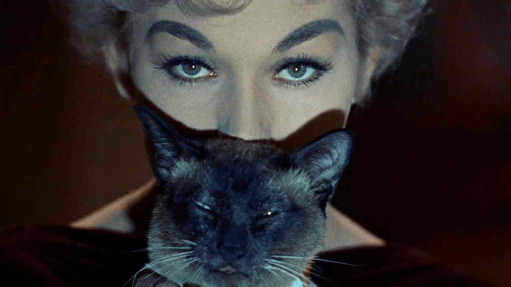 It was the morning after I visited my old college town (Athens, Ohio) for the first time in two years. I ended up crashing on a friend’s couch when I couldn’t bear to leave yet, even though I intended to drive home the night before (I always have an overnight bag, so no worries). My friend’s dog pounced on the stuffed ghost toy I brought him while I opened my Instagram to share some photos of an always-stunning Athens autumn. The very first thing I saw was an image from a film I did not recognize. It was of a woman with short blonde hair and intense eyes, peeking over the top of a cat’s head. I had to know where the image was from and opened the caption. The film was Bell, Book and Candle (1958), which I immediately added to my watchlist based on that single image. I watched it after I went home, finding out right away that it is set during the holidays. I had not decided on this year’s holiday horror film at that point. Since it was so different from other films in consideration, Bell, Book and Candle became the one.