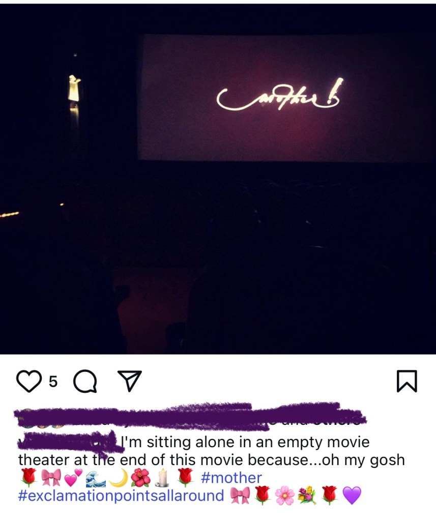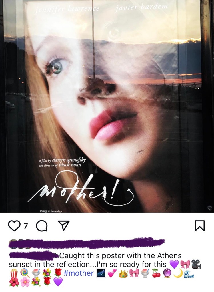 I sat in a dark theater at the Athena Grand (rest in peace). I watched the credits of Mother! by Darren Aronofsky, very much stunned by what I had just seen. I will never forget that experience or the gorgeous Athens sunset that night (see successive Instagram posts captioned with my shocking overuse of emojis below). Mother! blew my mind then, and it continues to today. I figured it was finally time to bring it into the blog lineup.