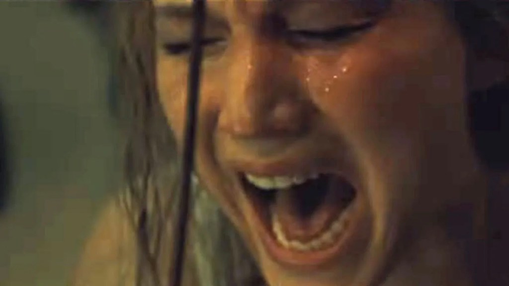 Man and Woman overstay their welcome for the next day or so. They ignore Mother’s house rules, leave food and trash everywhere, and damage property. Woman asks Mother personal questions and tries to pry into private details about her relationship with Him. Just when it seems the awkward situation could not get worse, Man and Woman’s two adult sons barge into the house. A fight erupts among the family, leading to one of the brothers injuring the other. After leaving Mother traumatized and alone for hours to take the son to a hospital, they return to share he has died. Once the couple and Him return, the house is overrun with mourners. Dozens of strangers enter the house throughout the evening and gradually cause damage to the house. Mother goes through the rooms to try to stop their destructive behavior while Him comforts the grieving parents. Mother finally has enough and banishes everyone except Him from their house.