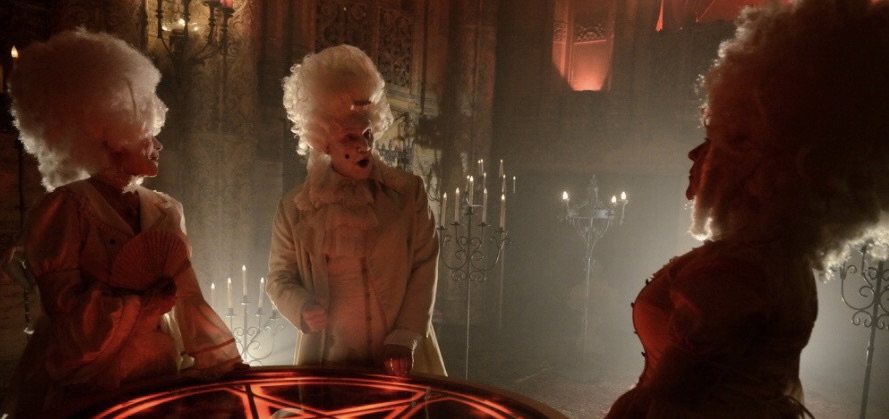 They take the five remaining survivors to an opulent ballroom and bind them to a gallows-like structure. The room is painted red and laden with dark velvet and candelabras. On a balcony above them, a man in head-to-toe aristocratic clothes, white makeup, and a powdered wig appears. The host, played by Malcolm McDowell (A Clockwork Orange), goes by the title Father Murder. He is joined by Sister Serpent (Jane Carr) and Sister Dragon (Judy Geeson), who arrive in similar attire. They reveal the kidnapped workers will be participating in an annual game called 31 in just a few minutes. Each player has a number (1-5) and survival odds assigned by the captors.