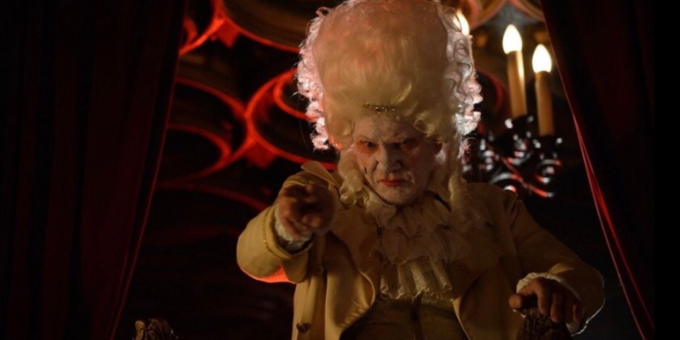 They take the five remaining survivors to an opulent ballroom and bind them to a gallows-like structure. The room is painted red and laden with dark velvet and candelabras. On a balcony above them, a man in head-to-toe aristocratic clothes, white makeup, and a powdered wig appears. The host, played by Malcolm McDowell (A Clockwork Orange), goes by the title Father Murder. He is joined by Sister Serpent (Jane Carr) and Sister Dragon (Judy Geeson), who arrive in similar attire. They reveal the kidnapped workers will be participating in an annual game called 31 in just a few minutes. Each player has a number (1-5) and survival odds assigned by the captors.