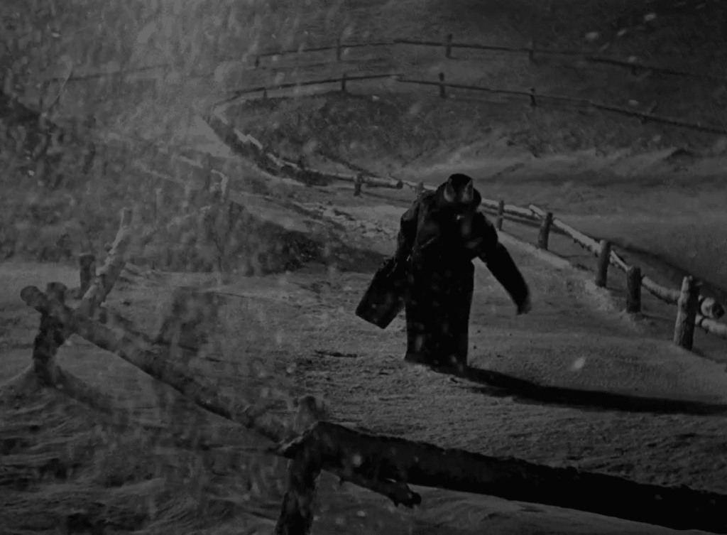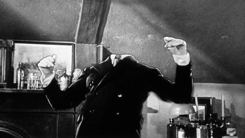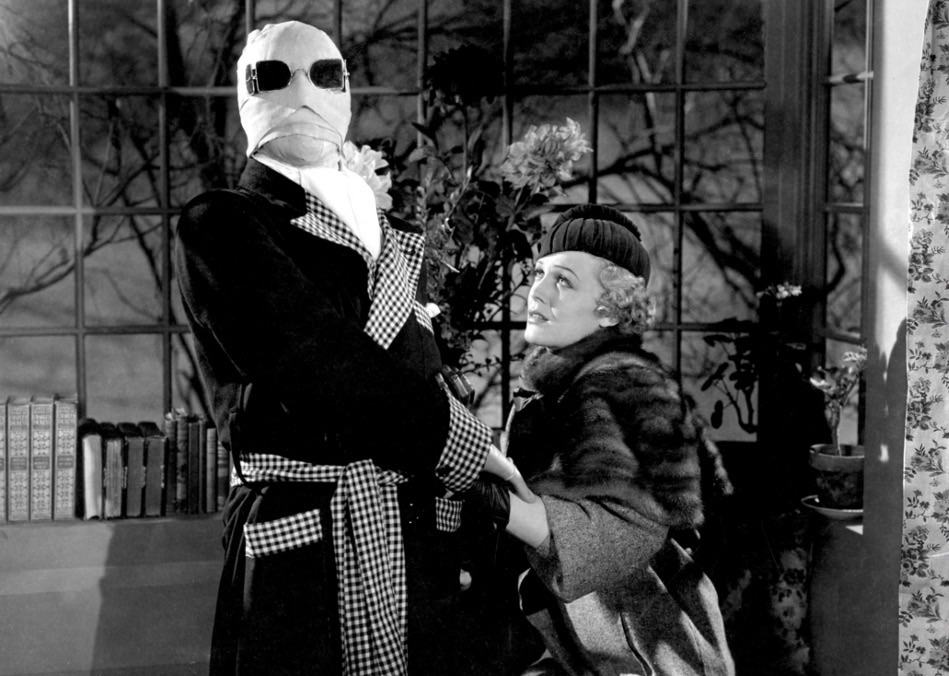 Watching another late January snowstorm out my living room window reminded me of one of my favorite wintry horror films: The Invisible Man (1933). Directed by the legendary James Whale (Frankenstein, Bride of Frankenstein), The Invisible Man is based on a novel of the same title by H.G. Wells and is included among the Universal Monsters classic horror films. Like many, I am sure, I first became aware of this film through the song “Science Fiction / Double Feature” from The Rocky Horror Picture Show (1975). I never expected to be so enamored with a horror film so heavy with science fiction, which has never really been my thing.