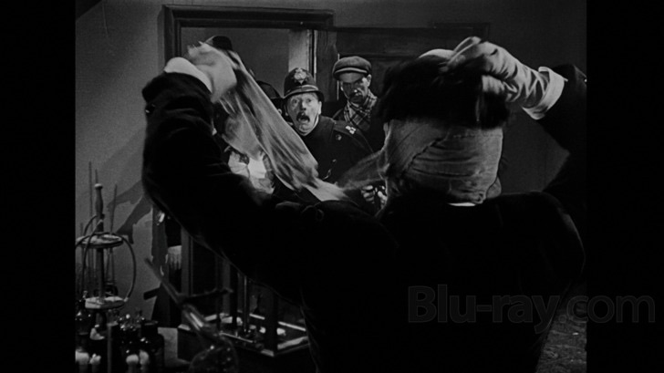 Tensions at The Lion’s Head escalate when Griffin falls a week behind on his bill and disturbs everyone with his behavior. He has set up an array of chemistry equipment in his room and becomes enraged when he is disturbed. Jenny has enough and sends her husband Herbert (Forrester Harvey) upstairs to kick Griffin out. In his anger toward the situation and Mr. Hall touching the lab equipment, Griffin ends up throwing the innkeeper down the stairs. When police arrive, Griffin finally snaps and removes his bandages. The officers and other locals watch in horror as Griffin removes his disguise and clothing to become more invisible. Once he is completely invisible, Griffin violently exits the inn and charges through the group gathered outside. His acts of violence and deception in the village are just the beginning of his reign of terror as he escapes into the larger world.